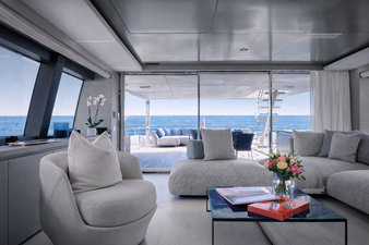 On board, space and atmosphere unfold gently: the sundeck, with its jacuzzi and bar, invites moments suspended between sky and sea, while luminous interiors offer a sense of calm and effortless comfort.