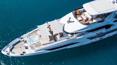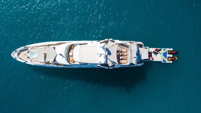 Outside, life centers around the 100-square-metre sundeck, a space designed for all hours of the day. A midship bar serves as the social hub, while the aft deck offers a wide, flat expanse for morning yoga or evening cocktails. Forward, a secluded seating nook provides a quiet spot for those seeking privacy. On the foredeck, a Jacuzzi and sunpads create a sweet little terrace for watching the yacht pull into port.